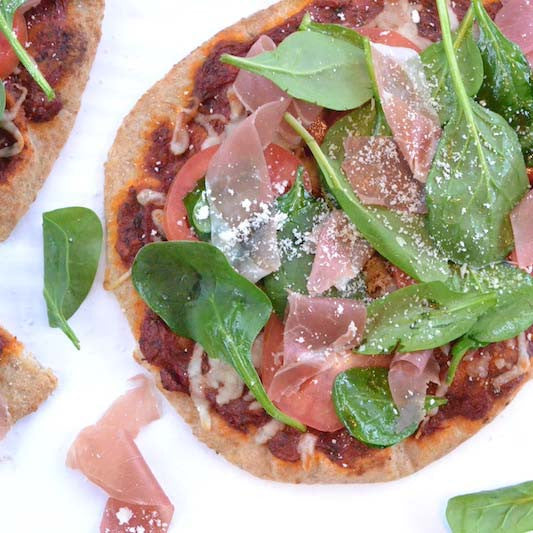Step 3: Remove pizza from oven. Top pizza with tomatoes, spinach and prosciutto. Finish with a light sprinkle of parmesan cheese. Enjoy! This dish is only 12 SmartPoints but a billion points of flavor!