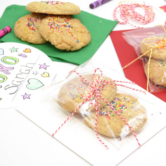These cookies definitely require one or two taste tests ;) Have your child package the cookies in clear party bags and seal with decorative tape. If you plan to hand deliver your thank you notes (great touch) use twine to tie the cookie package to the envelopes. If you are mailing them, put the card and cookies in a padded envelope.