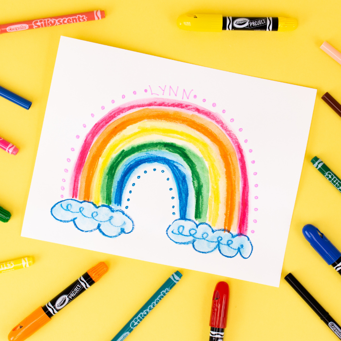 - Draw your clouds at the bottom of each end of your rainbow with the blue crayon.