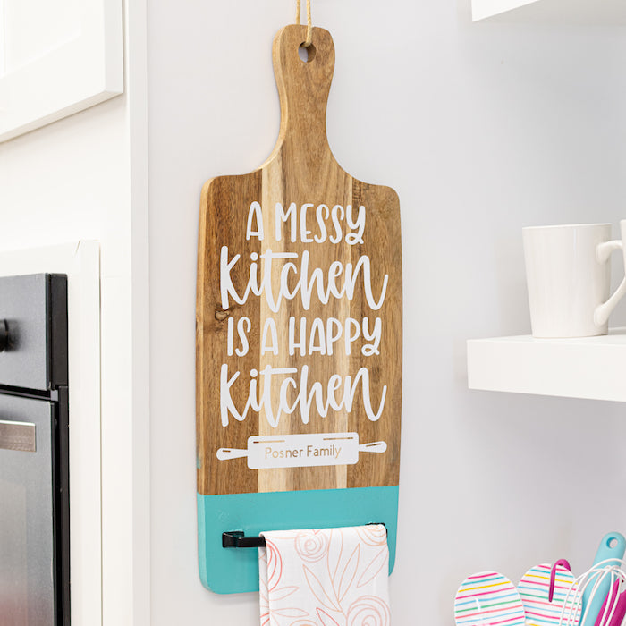 Once the glue was dry I hung the board in our studio kitchen and add a kitchen towel!