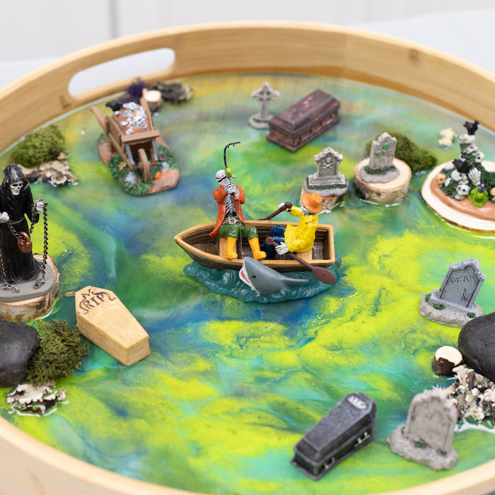 As I get ready to decorate for Halloween I am creating some fun DIY displays for my favorite Lemax Collectors Club Spooky Town collectibles. Today I am sharing how easy it is to make a spooky pond to display your Lemax accessories alongside the smoking Skull Cave Quarry.