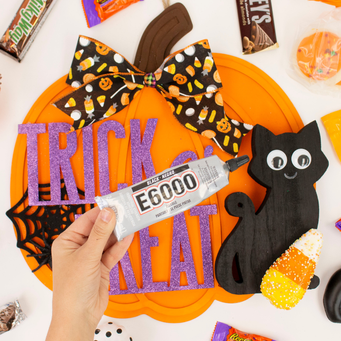 - Using your E6000 Black, glue the cat to the wood pumpkin.
