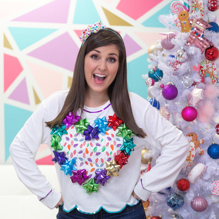 I love rocking an ugly sweater and breaking out in bad dance moves on the regular during the holiday season. I teamed up with Offray to create a bowtastic ugly sweatshirt, headband and shoe clips so I can show off my goofy dance moves!