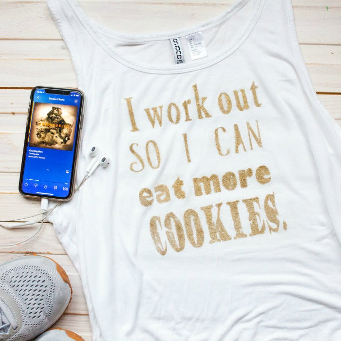 Winter had me all cooped up in the gym and I can't wait until spring is here so I can take my workout outside. I'm getting ready! New tanks can be pricey. I'm whipping up a DIY heat embossing technique to re-purpose my old workout tanks. What better way to customize my own workout motivation than to create my own message! I work out so I can eat more cookies. This is my motivation.