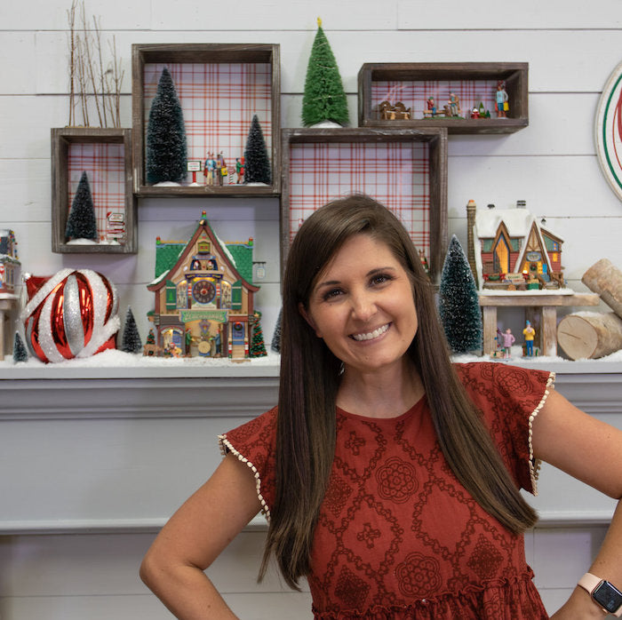 My latest DIY display for my favorite Lemax Collectors Club holiday pieces is the easiest to date and so festive! You can repurpose a hanging shadow box shelf with wallpaper to create the perfect settings for your Lemax houses and accessories.