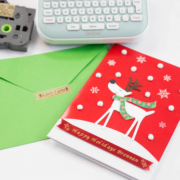 The holidays are here and life is crazy. This year more than ever I understand the craziness but I still want to give my friends and family gifts with a personalized touch. I might not have hours to spend on making gifts but I love that the Brother P-touch Embellish allows me to add a personal touch to a gift in literally 90 seconds! For the next few weeks, I will be sharing Fa la la la Friday 90 Second Gift Ideas that you can personalize with the P-touch Embellish! This week I am kicking it off with a quick and easy way to add a special touch to a greeting card.