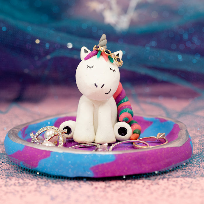 It’s no secret that I’ve been obsessed with unicorns lately. Since my baby’s nursery theme is magical unicorns, our entire team has been on a unicorn kick. Our production manager, Hope, had a cute idea to create a unicorn ring dish with the new Sculpey III Glitter! It’s perfect for when I need a safe place to stash my jewelry for playtime. Sculpey has been a team favorite for all types of crafts and gifts. We are so excited to be one of the first to try out the new glitter colors of Sculpey III. It molds so perfectly in your hands and then hardens in my oven for instant, no-fail DIY projects for years to come with the perfect amount of sparkle.