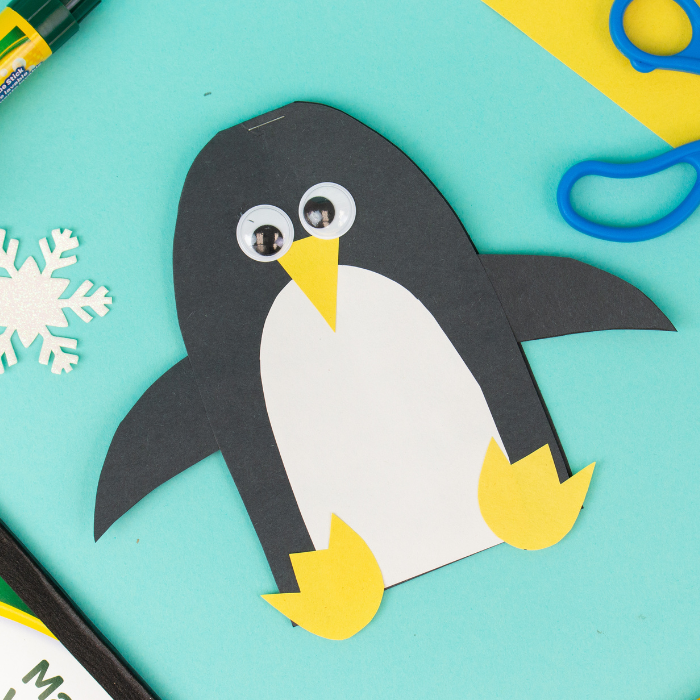 - Glue your penguin feet and nose to the front of your notebook using your glue stick.