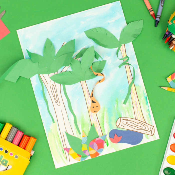 - Create your snake with orange construction paper. Draw marks with a marker. Use your pencil to wrap the snake around to create the curves/waves as shown below. Glue it to the canvas.