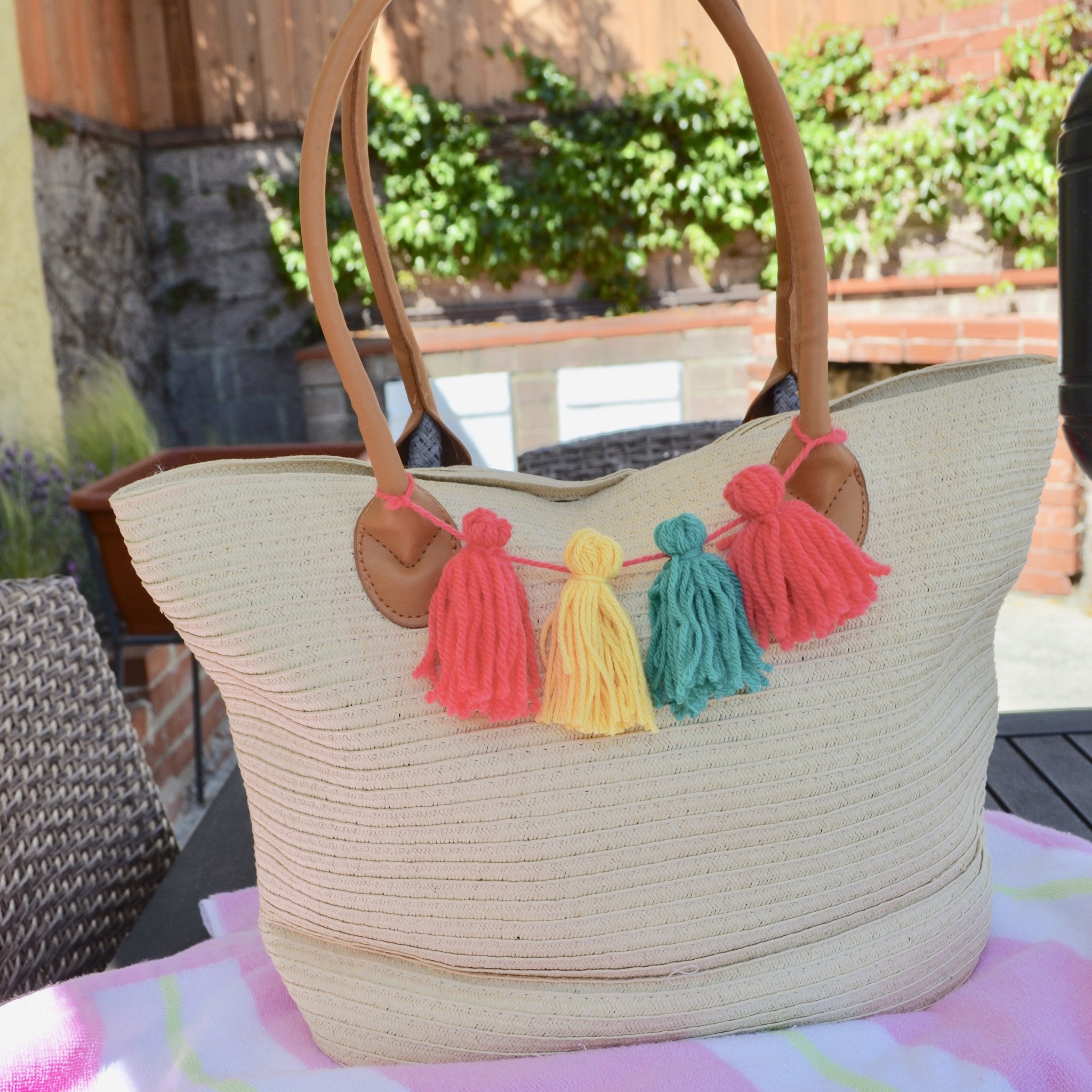 Making DIY pom poms and tassels are beyond easy and inexpensive. All you need is some yarn and a pair of scissors! I love the idea of adding these to beach bags to give it a little bit of a pop, and that is exactly what I did! I wanted to show you how you can make both the pom poms and the tassels, AND how they both would look on the same bag. You can get really creative with this, and add them all over the bag, or any way you like.