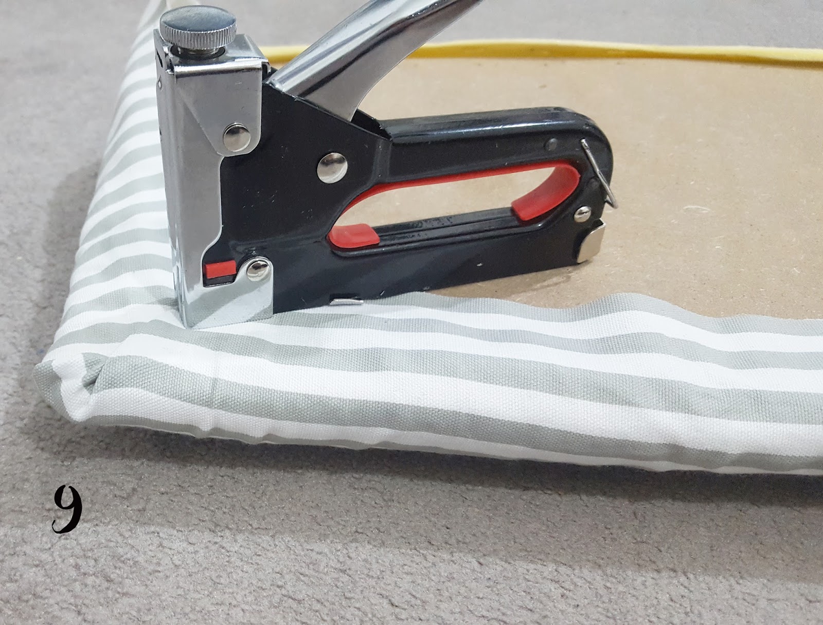 - Once you have stapled it all down, screw the cushion board back onto its legs.