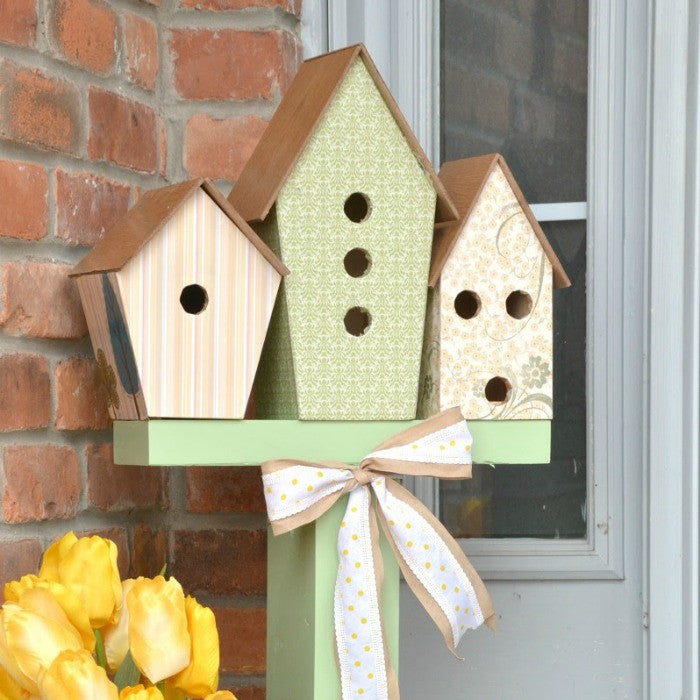 I chose to build three whimsical houses with angled-in bottoms for my birdhouse decor.